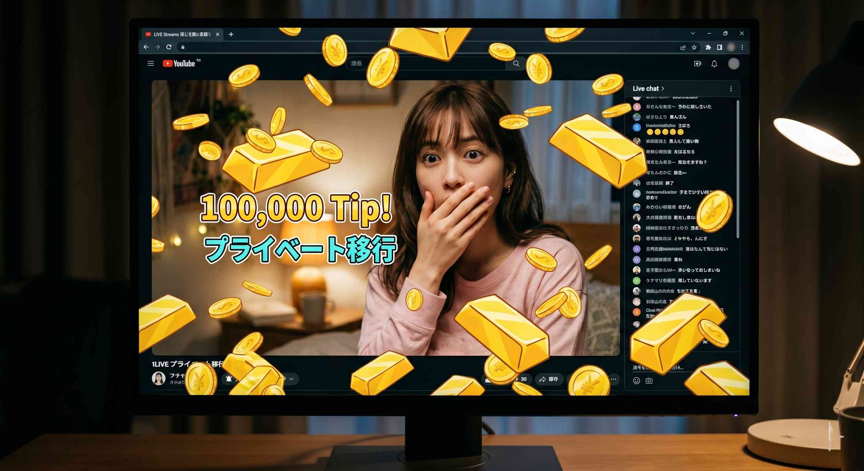 その夜、私のルームに現れたのは「K」という日本人の固定客でした。彼は現れるなり、画面を埋め尽くすほどの高額チップを投げ始めました。その額、合計で約10万円分。ライブチャットの画面が金色のエフェクトで埋め尽くされます。